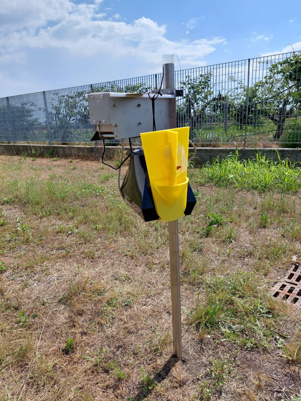 The insect traps our team evolved include electronic devices with 10 MP lenses on the top of the housing and are self-sufficient through a battery and a solar panel. The traps are equipped with sensors collecting climatic data, like temperature, relative humidity, or wind, which will be used to get more detailed insight into the flight behavior of P. japonica. In addition, the trap system is equipped with a lure, attracting the target species entering the trap system. After entering the trap, insects get fixed and photographed. The photos serve as a base for the development of an automatic detection tool specifically for P. japonica. Deep learning systems using artificial neural networks are training the system to detect and separate the targeted insect from non-targets, as previously presented on this blog post.